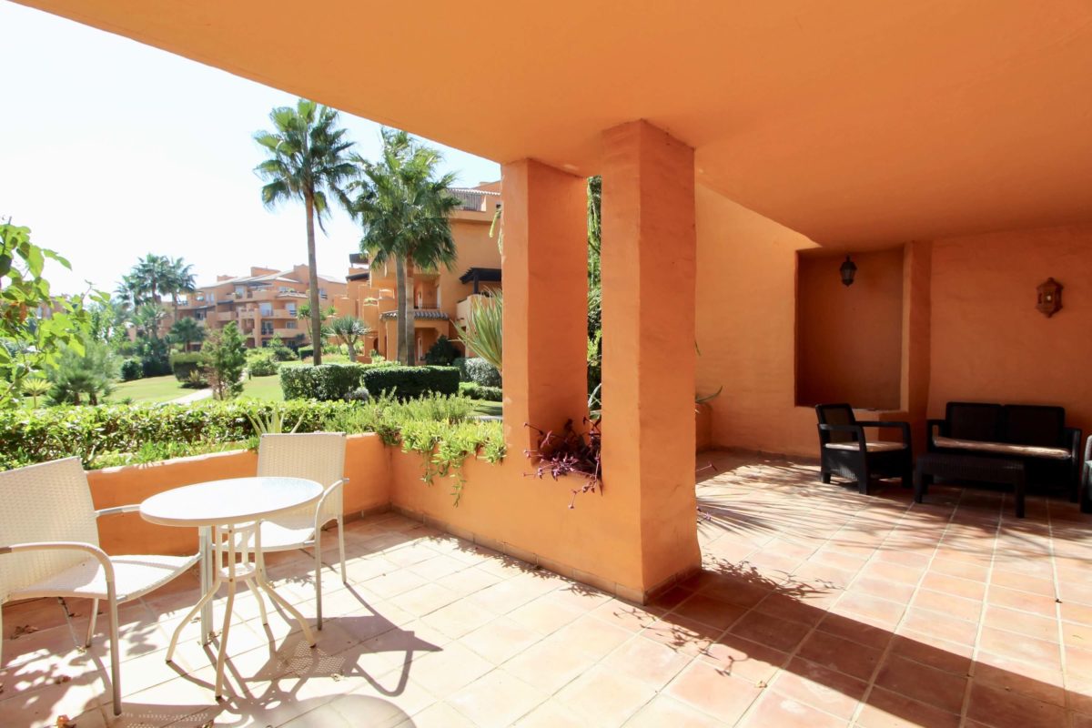 Excellent ground floor apartment for sale in the best beach complex of La Duquesa. This unique urbanization located right on the beach enjoys 24-hour security, private gated entrance, beautiful gardens and swimming pool.